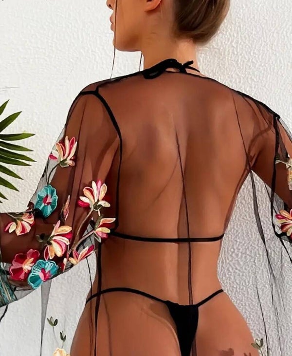 Haut brodé ouvert sur le devant, semi transparent, sexy haut mi-long manches 3/4 pour le printemps et l'été pour femmes sensuelle pour son copain, mari et son petit voleur