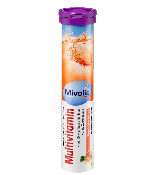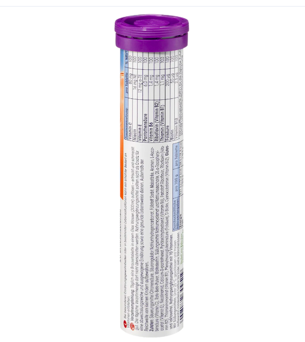 Description exacte du produit : Complément alimentaire avec 10 vitamines. Avec édulcorants. Acidifiant : acide citrique, correcteur d'acidité : bicarbonate de sodium, édulcorant : sorbitol, amidon de maïs, arômes, acide L-ascorbique (vitamine C), poudre de betterave, édulcorants : cyclamate de sodium et saccharine sodique, acétate de DL-alpha-tocophéryle (vitamine E), nicotinamide, D-pantothénate de calcium, chlorhydrate de pyridoxine (vitamine B6), colorant : riboflavine, riboflavine (vitamine B2), mononitrate de thiamine (vitamine B1), acide ptéroylmonoglutamique (acide folique), D-biotine, cyanocobalamine (vitamine B12).