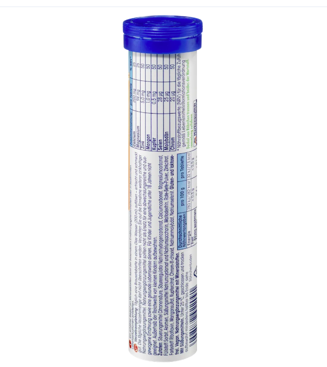 Nom exact du produit : Complément alimentaire avec minéraux. Avec édulcorants. Ingrédients : Acidifiant : acide citrique, correcteur d’acidité : bicarbonate de sodium, carbonate de calcium, carbonate de magnésium, agent de charge : sorbitol, arômes, édulcorants : cyclamate de sodium et saccharine sodique, maltodextrine, poudre de betterave, citrate de zinc, colorant : riboflavine, sulfate de manganèse, citrate de cuivre, chlorure de chrome III, molybdate de sodium, sélénite de sodium.