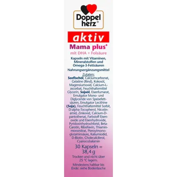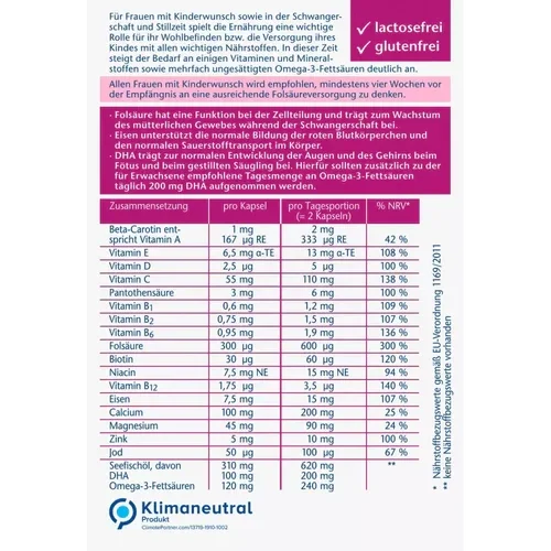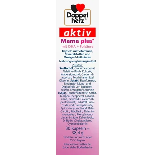 Les capsules Doppelherz Mama plus+ avec DHA + acide folique fournissent 600 μg d'acide folique ainsi que toutes les autres vitamines B et les minéraux calcium, magnésium, fer, zinc et 100 μg d'iode. De plus, les gélules contiennent des acides gras oméga-3 dont 200 mg de DHA par jour. Ils sont idéaux pour les femmes qui souhaitent avoir des enfants et pendant la grossesse et l'allaitement. Car dans cette phase de la vie, les besoins en certaines vitamines et minéraux augmentent considérablement.